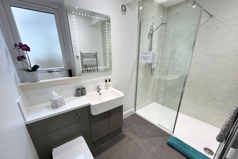 Ground floor bathroom with walk in shower, WC, basin, towel rail and underfloor heating.